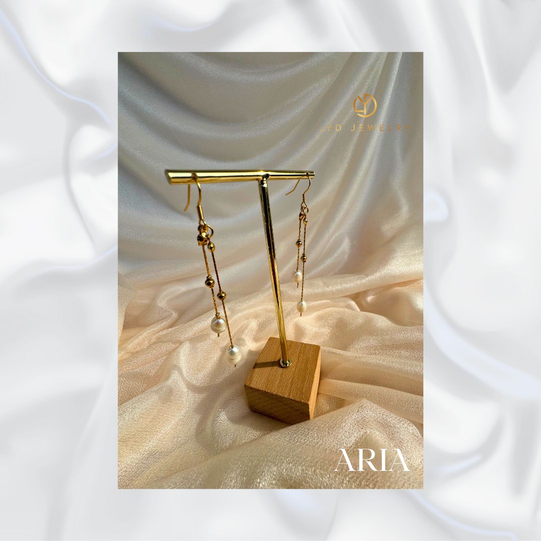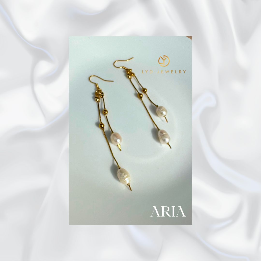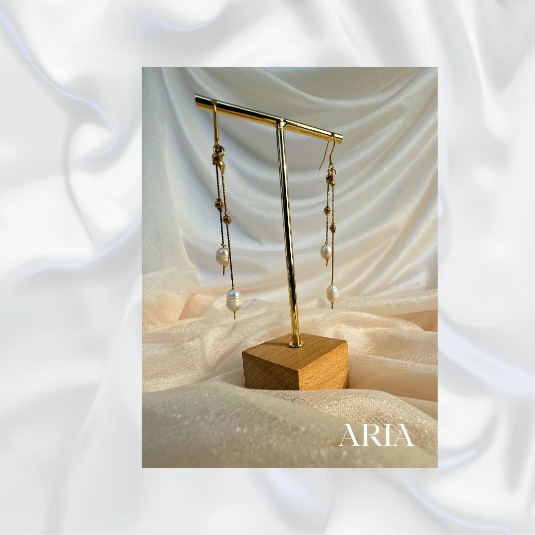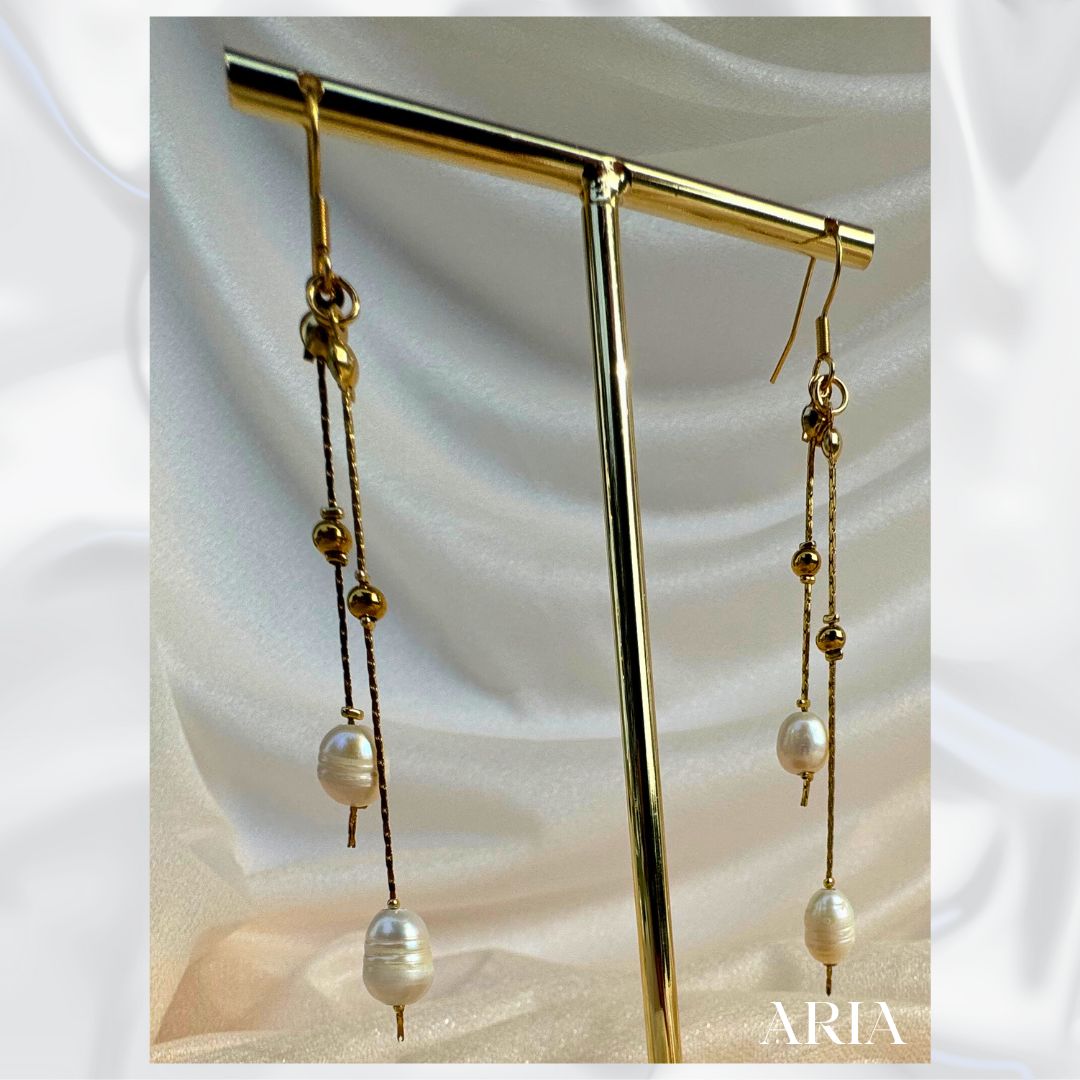 Inspired by the name Aria, meaning "air" and symbolizing grace, these handcrafted earrings exude timeless elegance. Featuring two delicate strands of freshwater pearls, the design combines sophistication and modern flair. Each strand is suspended from a sleek Cardano chain made from stainless steel with PVD coating, ensuring both beauty and durability.