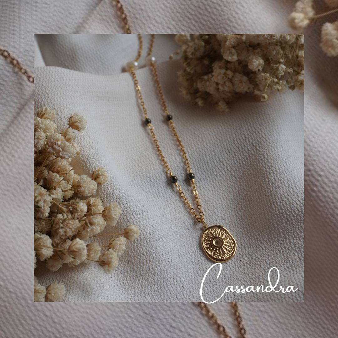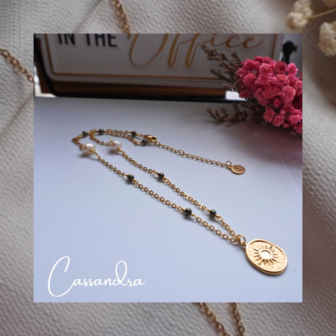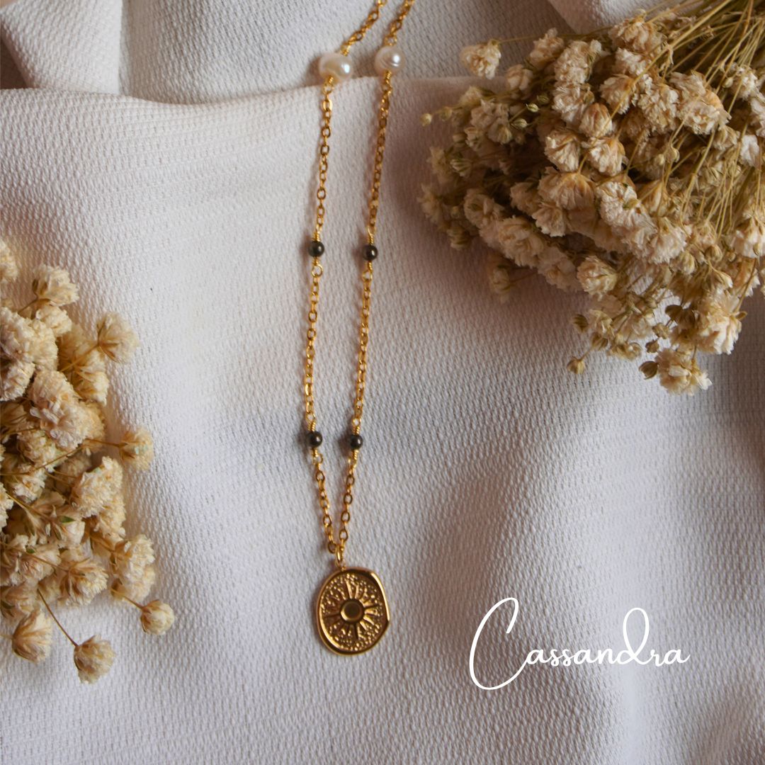 Cassandra Necklace brings together the organic elegance of pearls and the natural allure of pyrite stone, crowned by a stunning sun pendant plated in high-quality gold. This necklace exudes a blend of earthy sophistication and radiant charm, making it a must-have for any jewelry lover.