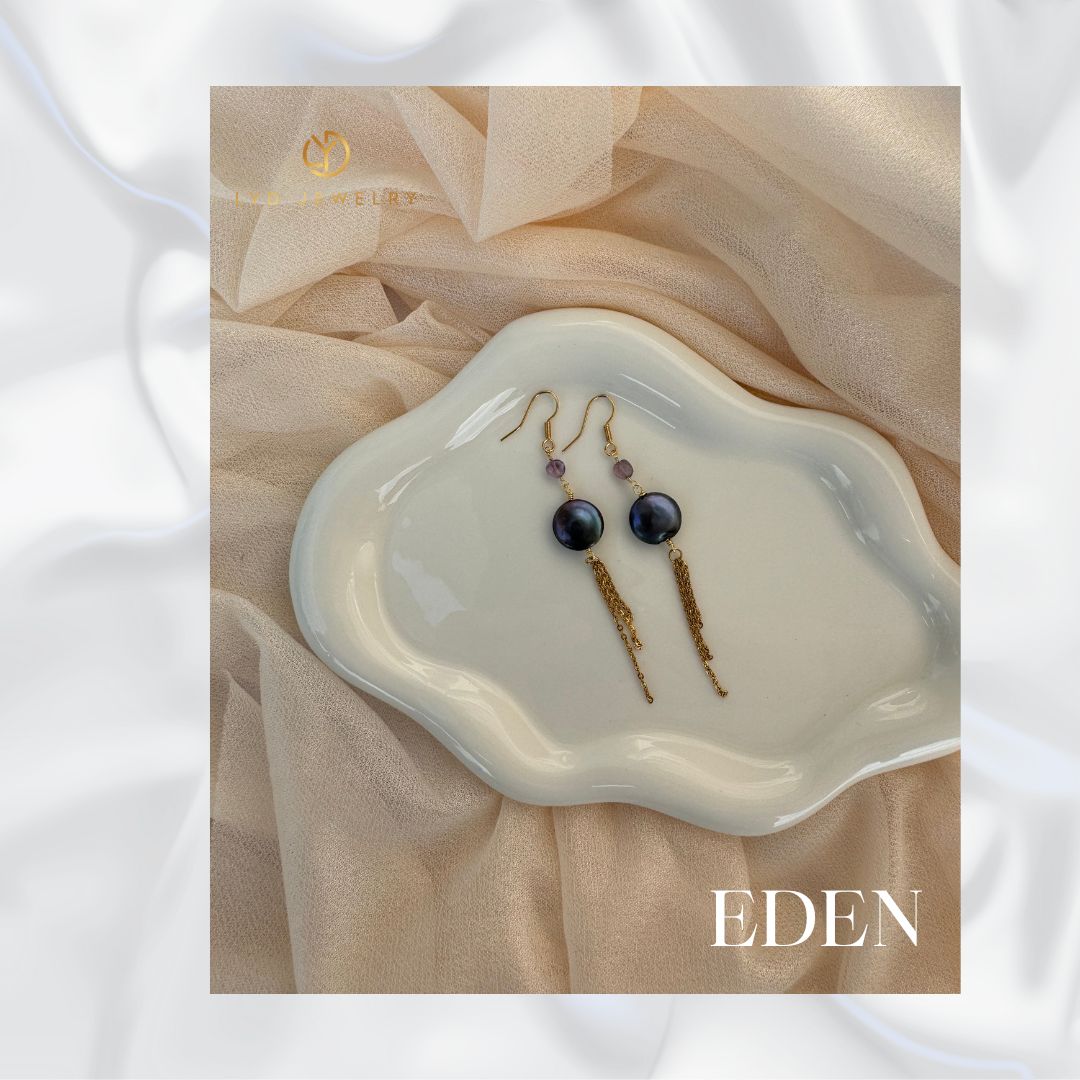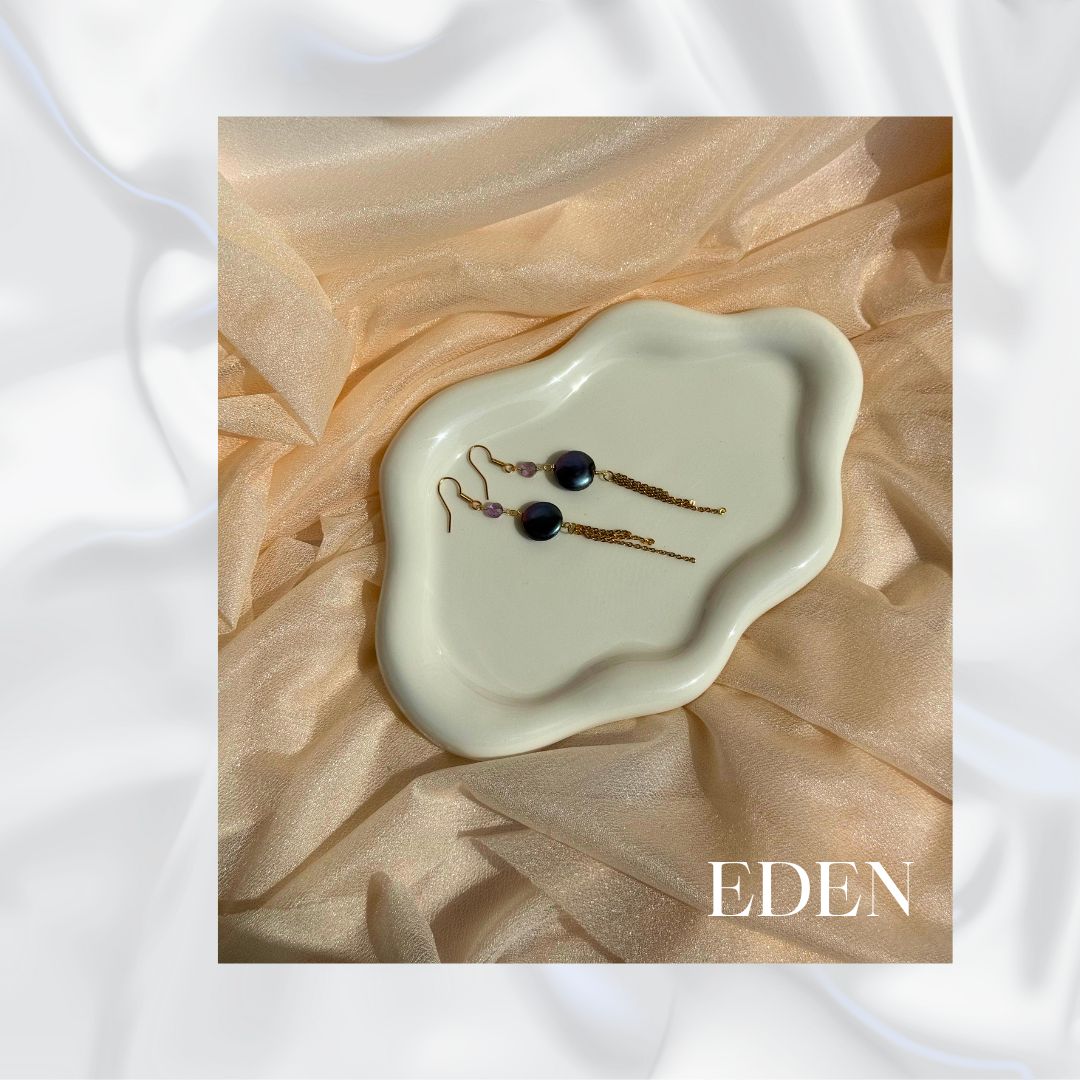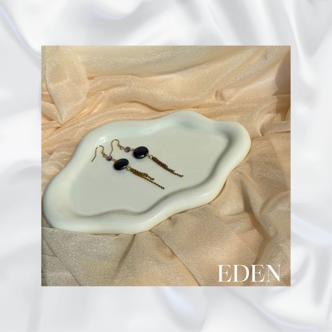 Eden Earrings evoke the beauty and mystery of nature’s finest elements. Featuring Prussian Blue Keshi Pearls, and a flat round faceted amethyst, these earrings capture a stunning contrast of deep hues and soft elegance. The gemstones are delicately set on a fine stainless steel chain with 18k PVD gold plating, ensuring both durability and luxury.