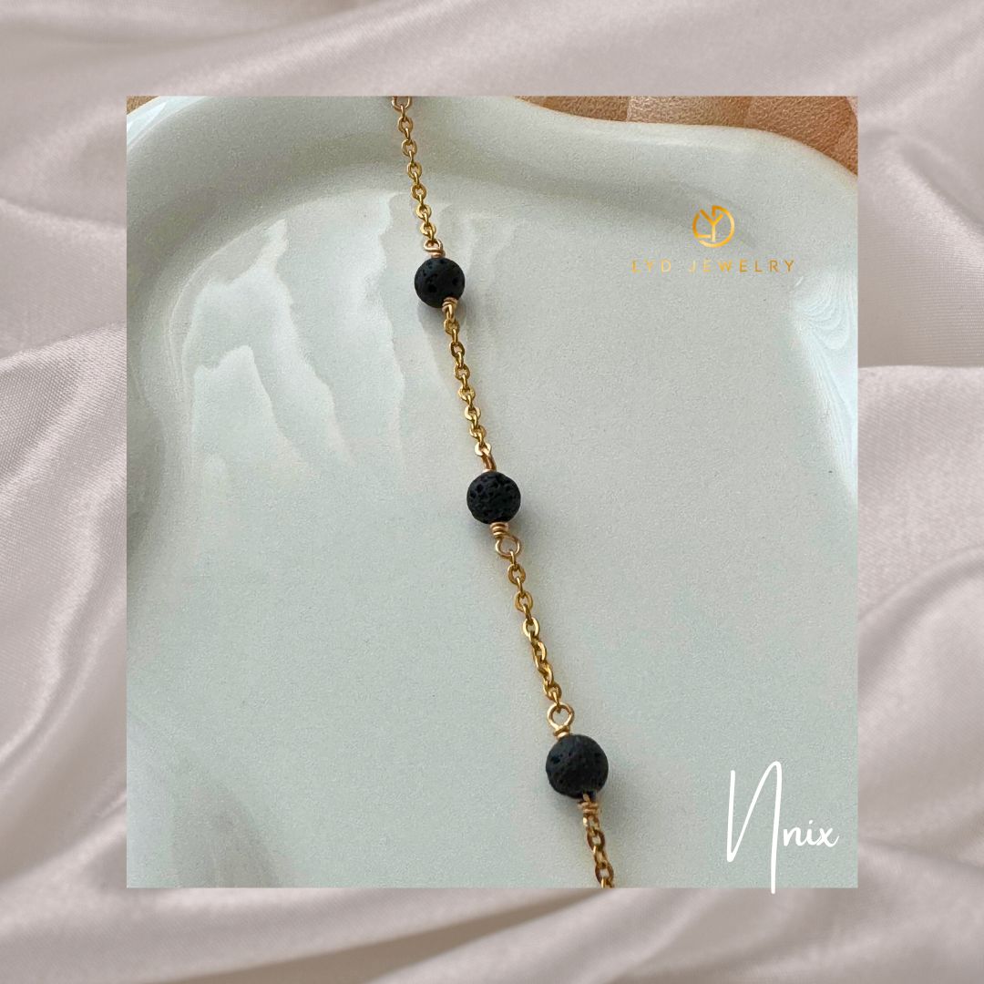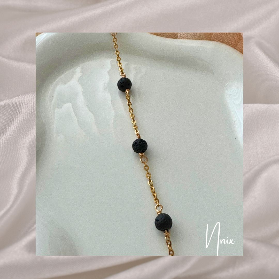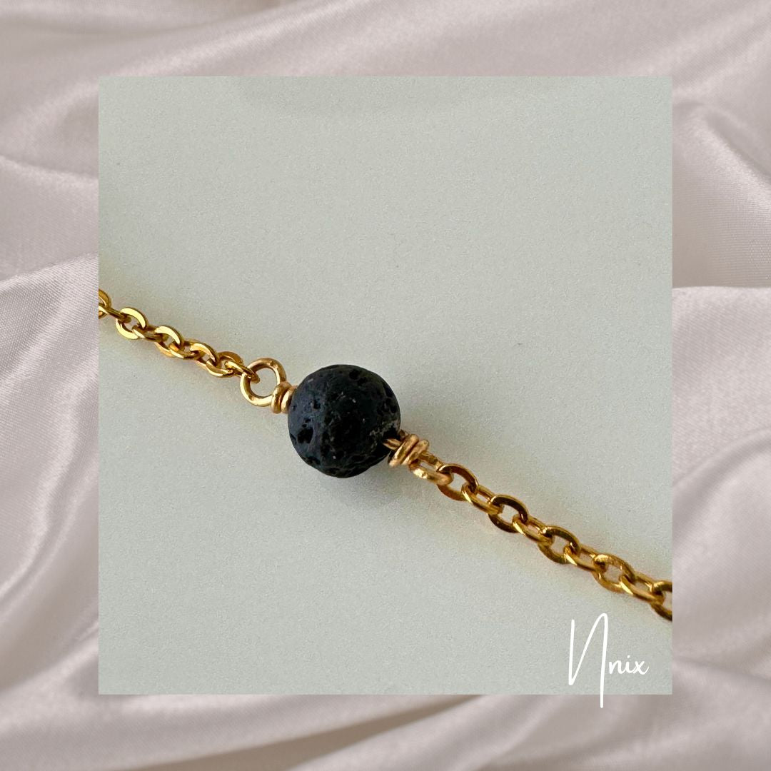 Inspired by the Greek goddess Nyx, who personifies the night and its deep mysteries, the Nyx Bracelet brings the allure of darkness and strength. Crafted with a soldered chain, plated in Real 18K Gold, this bracelet is paired with volcanic stone, a material known for its raw beauty and grounding energy. Volcanic stone, also called lava rock, is believed to bring balance, courage, and stability, offering a connection to the earth's natural energy.