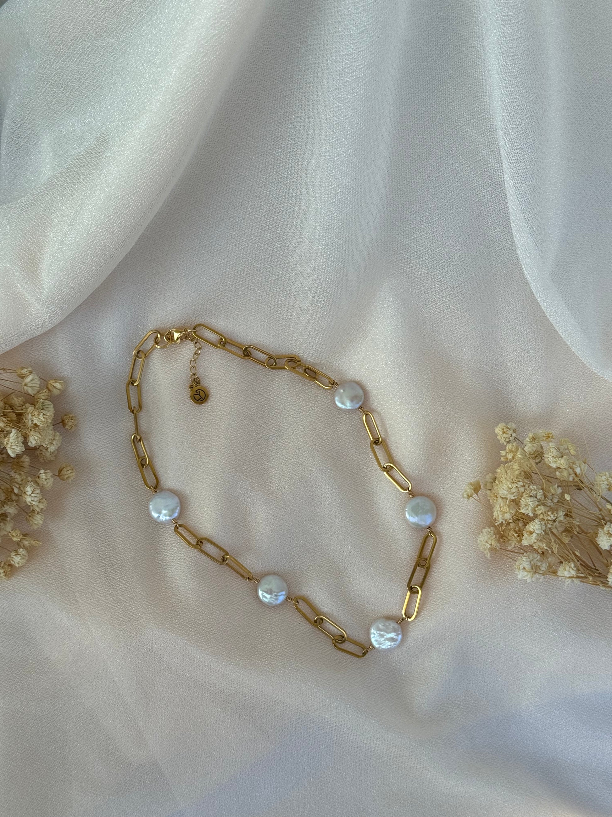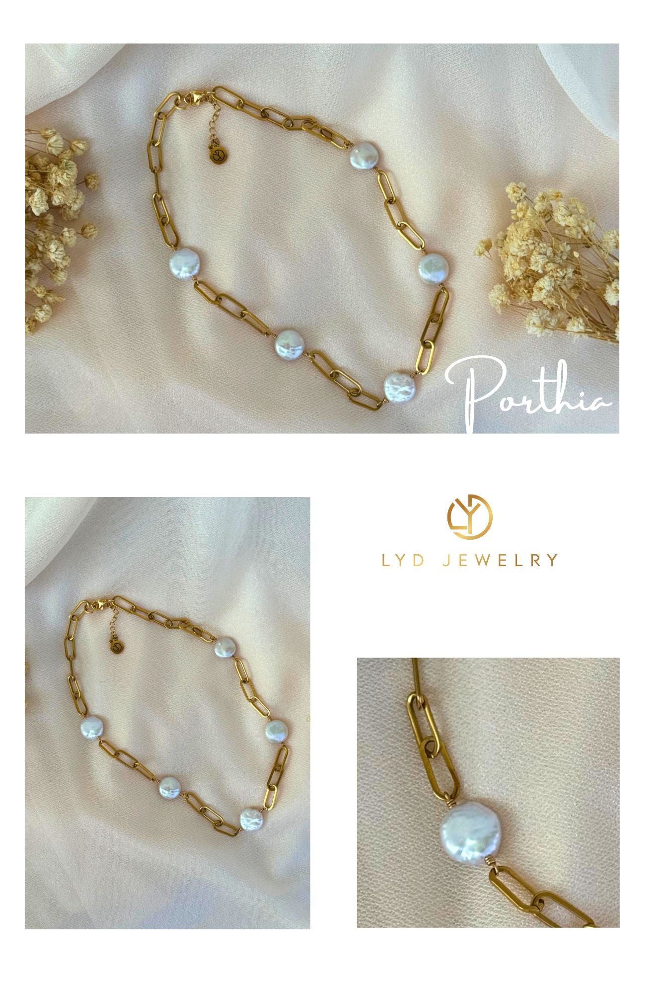The name Portia is often associated with strength and nobility, embodying a sense of grace and dignity. The Portia Necklace features 16 inches (40.64 cm) of a beautiful, chain plated, adorned with exquisite Keshi flat round pearls that add a touch of natural elegance. With an additional 2-inch (5.08 cm) extension, this necklace perfectly blends sophistication and modernity.